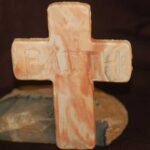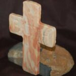 Greg Kickingbird a Cherokee artist, makes beautiful pottery using naturally colored clay. With great attention to detail he carefully creates the mold for each piece. When the colors mix and swirl, beautiful variations in design occur throughout the pottery, making each piece unique. This Faith Cross plaque has a metal hanger and measures 6 inches tall by 4 3/4 wide.